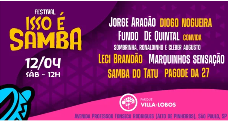 No dia 12 de abril (sábado), São Paulo se transforma na capital do samba e o Parque Villa Lobos será palco de um evento inédito, onde a grandiosidade desse estilo musical tão amado será celebrada em mais de 10 horas ininterruptas de música, tradição e emoção. Os gigantes do gênero estarão juntos em um festival histórico: Jorge Aragão, Diogo Nogueira, Leci Brandão, Marquinhos Sensação, Samba do Tatu, Pagode da 27, Thiago Bispo, Grupo Façanha e, para coroar essa grande festa, uma celebração especial dos 45 anos do Fundo de Quintal – com um reencontro inédito entre os ex-integrantes Sombrinha, Cleber Augusto e Ronaldinho.